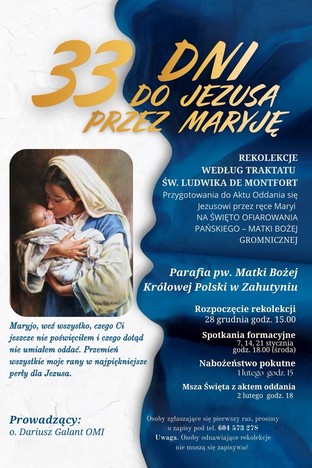 12. Misjonarze Oblaci Maryi Niepokalanej z Zahutynia zapraszają na rekolekcje „33 dni do Jezusa przez Maryję”, które poprowadzi o. Dariusz Galant. Spotkania formacyjne odbywać się będą raz w tygodniu. Osoby, które pierwszy raz zechcą uczestniczyć w rekolekcjach lub odprawiały je indywidualnie, proszone są o zapisy pod podany numer telefonu w celu zakupienia książek. Więcej informacji na plakacie.